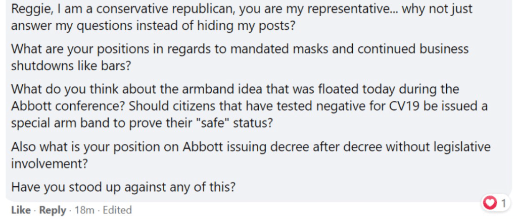 Reggie has spent his career in Austin finding ways to hide and avoid accountability. This is not the type of “leader” that is needed in one of the most conservative districts in Texas. We need a leader that will push for conservative priorities; and in today’s world we require a representative that will push back hard against the incoming tyranny masquerading as emergency actions.